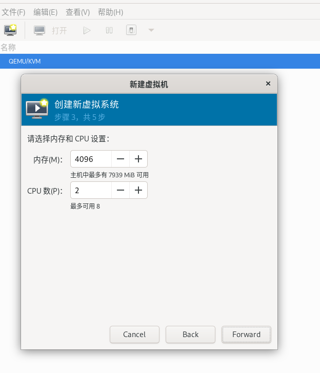 选择内存大小和CPU核数。分配给虚拟机的内存大小和CPU数不能超过宿主机拥有的内存大小和CPU数。这里根据实际情况分配足够大的内存及CPU数即可。本示例中只安装一个最小化的系统,不需要很多内存和CPU,这里选择默认配置,直接点击“Forward”。
