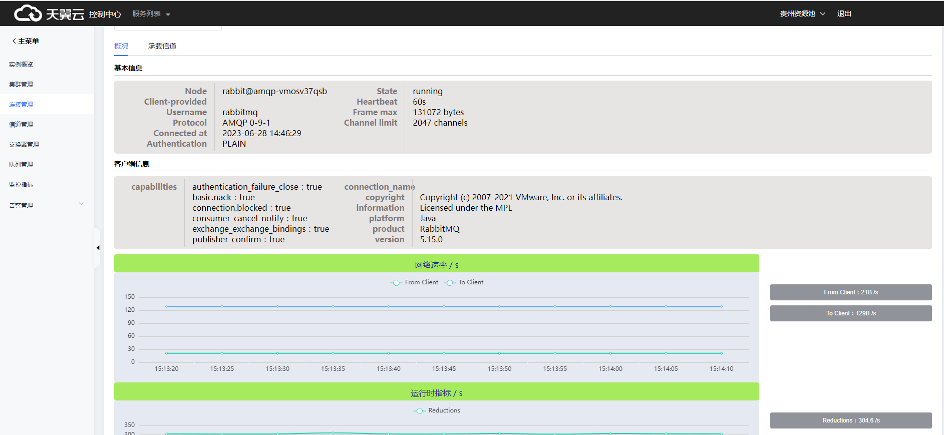 (2)查看连接概况,包括基本信息、客户端信息、网络速率统计、运行时指标等。
