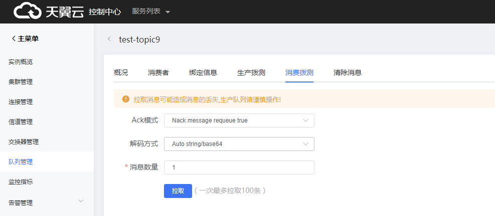 (5)点击“消费拨测”,即可进入队列的消费拨测页面。通过消费拨测可以拉取队列的消息。