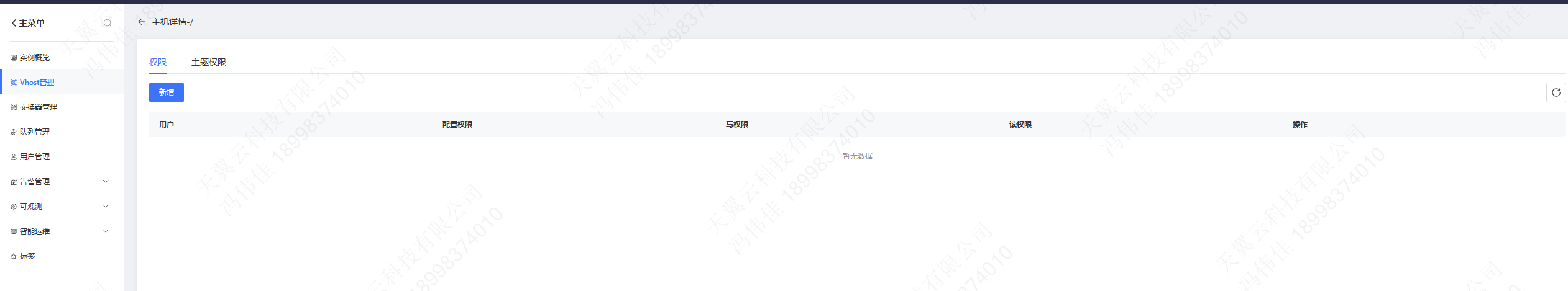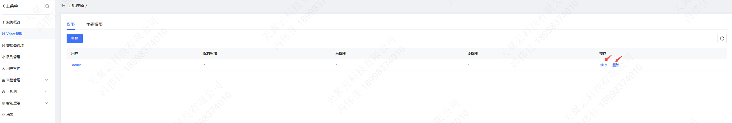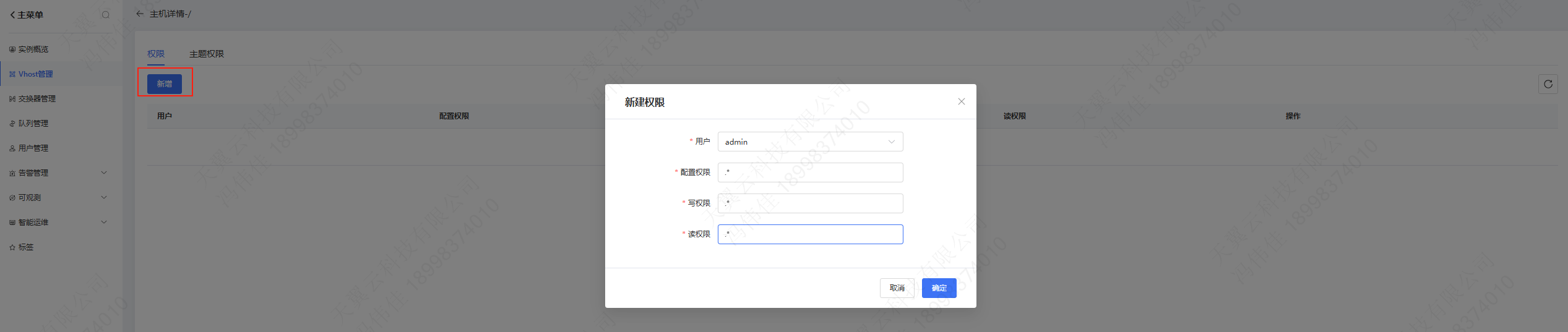 在具体的权限管理页,点击新建,选择指定用户,配置权限为".*"、".*"、".*",则该用户拥有对虚拟主机下全部资源的配置权限、写权限和读权限: