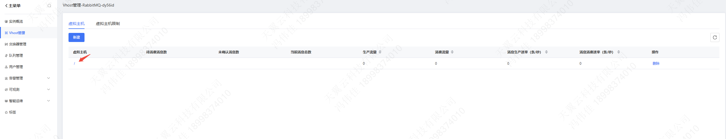 进入具体的实例管理页面,点击Vhost管理,在vhost列表页,针对指定的vhost,点击vhost进入具体的权限管理页: