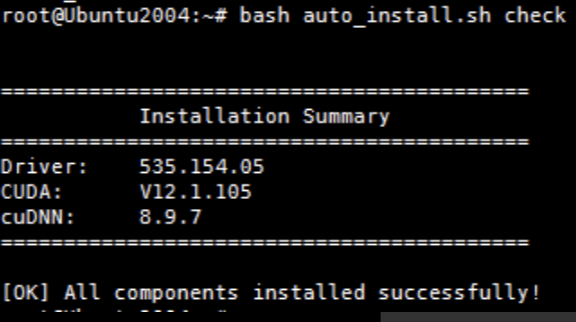 bash auto_install.sh check从示例可以看出安装已成功完成,驱动版本为535.154.05、CUDA版本为V12.1.105、cuDNN版本为8.9.7。