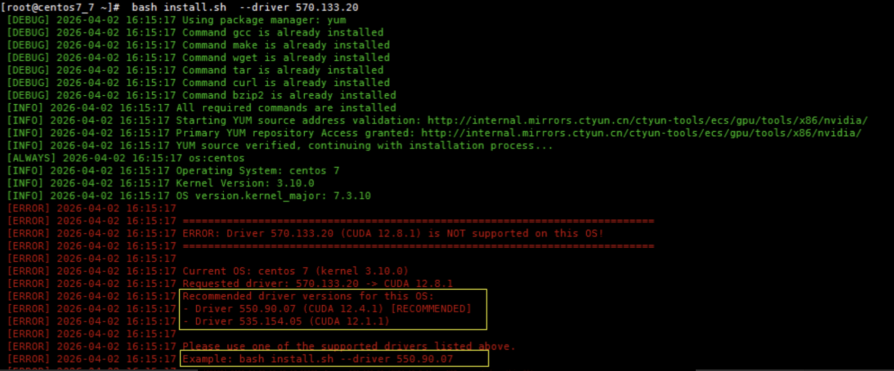如果用户指定了驱动版本,但是脚本执行的时候打印了版本不支持的信息,请根据脚本提示使用正确的版本。如截图中的示例,可以使用550.90.07或者535.154.05的驱动版本。