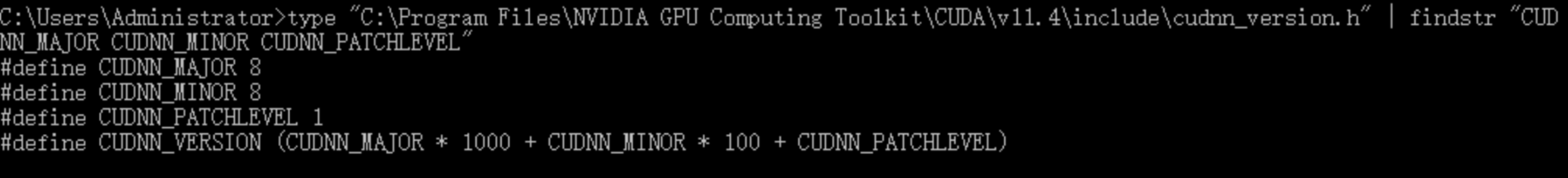type "C:\Program Files\NVIDIA GPU Computing Toolkit\CUDA\v11.4\include\cudnn_version.h" | findstr "CUDNN_MAJOR CUDNN_MINOR CUDNN_PATCHLEVEL"输出以下内容,说明安装成功。