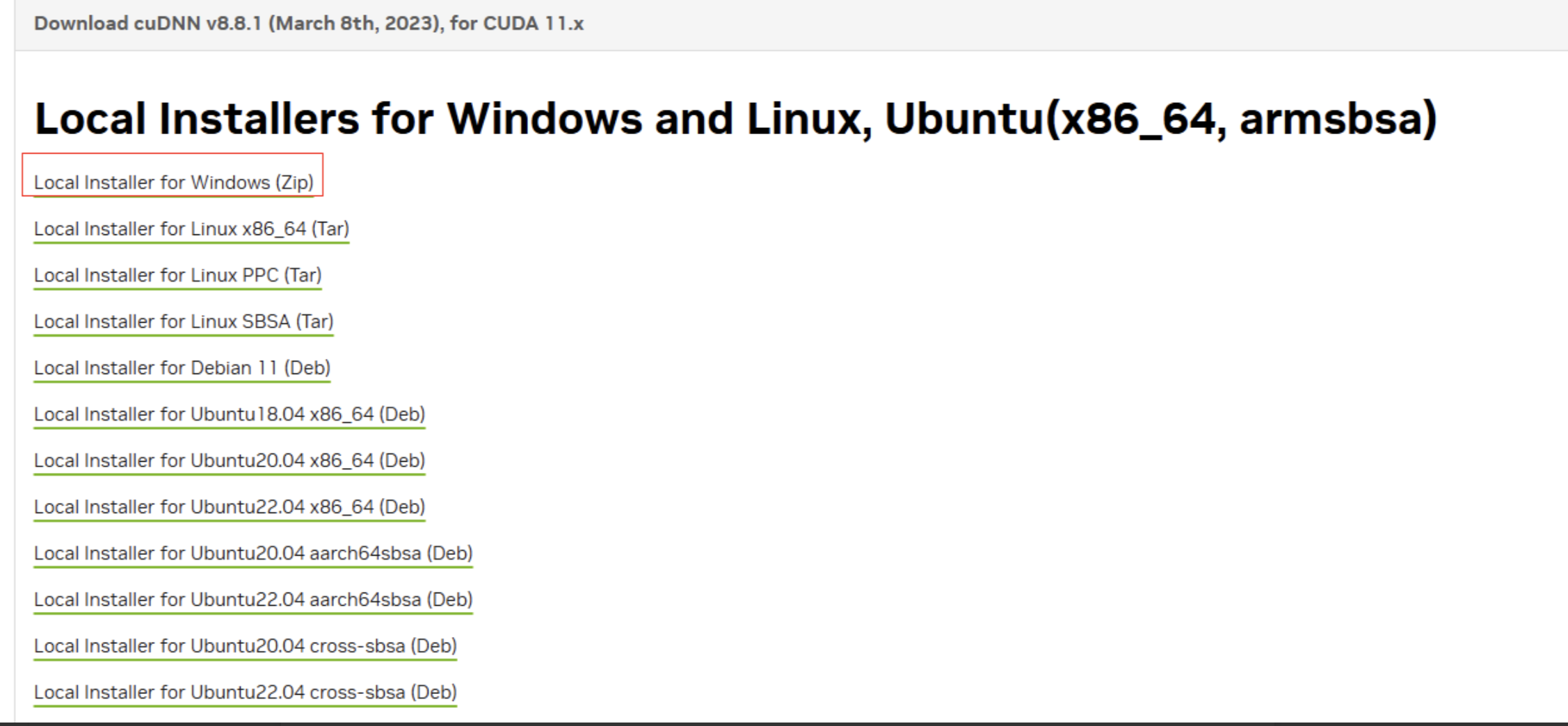 获取cuDNN安装包下载链接。本章以Windows Server 2016 x86_64系统、CUDA 11.4.0版本、cuDNN8.8.1版本为例进行安装。访问cuDNN下载官网,选择符合要求的cuDNN版本,点击下载。