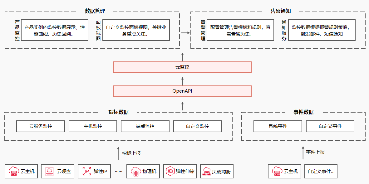 | 事件监控 | 事件监控提供了事件类型数据上报、查询和告警的功能。方便您将业务中的各类重要事件或对云资源的操作事件收集到云监控,并在事件发生时进行告警。 |