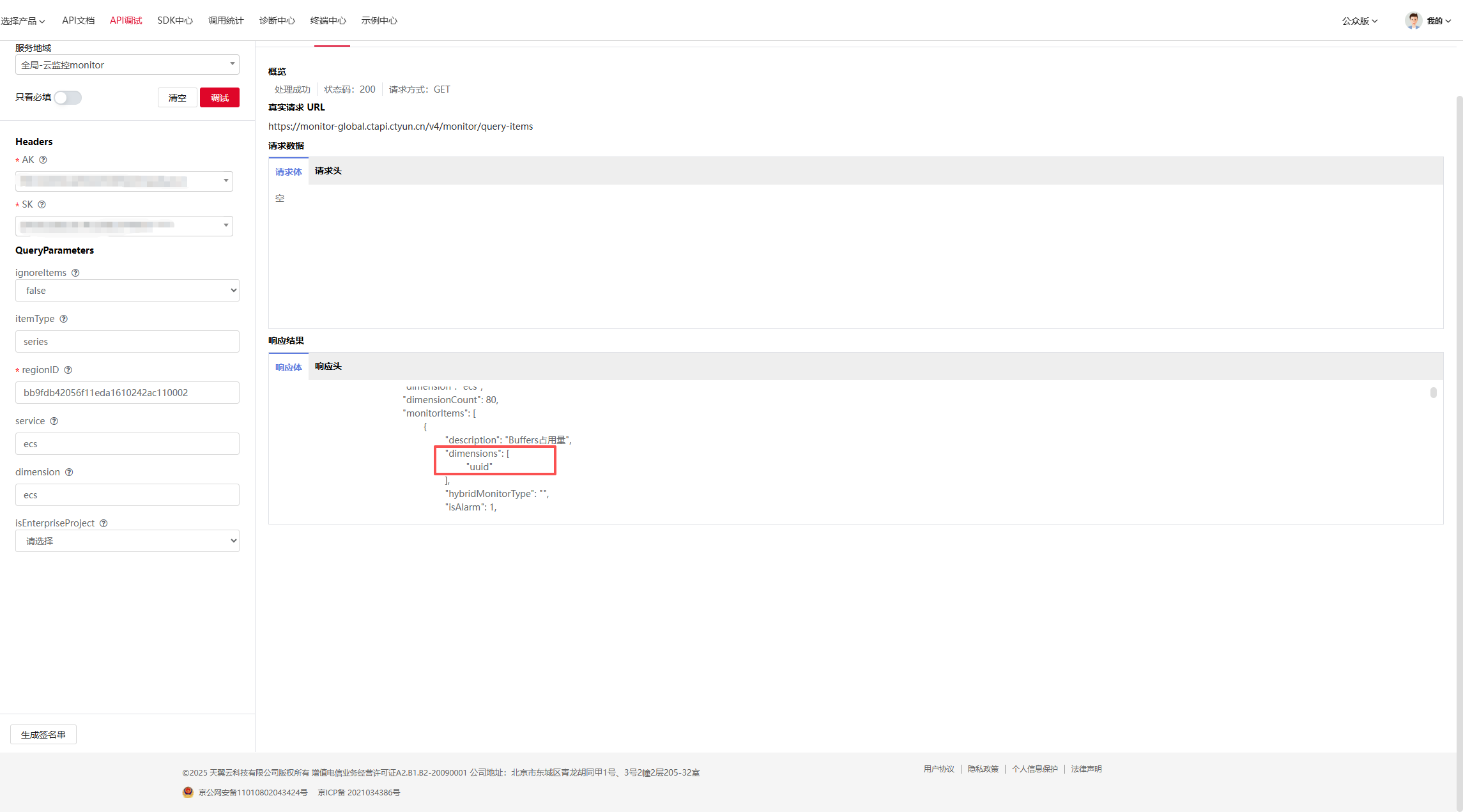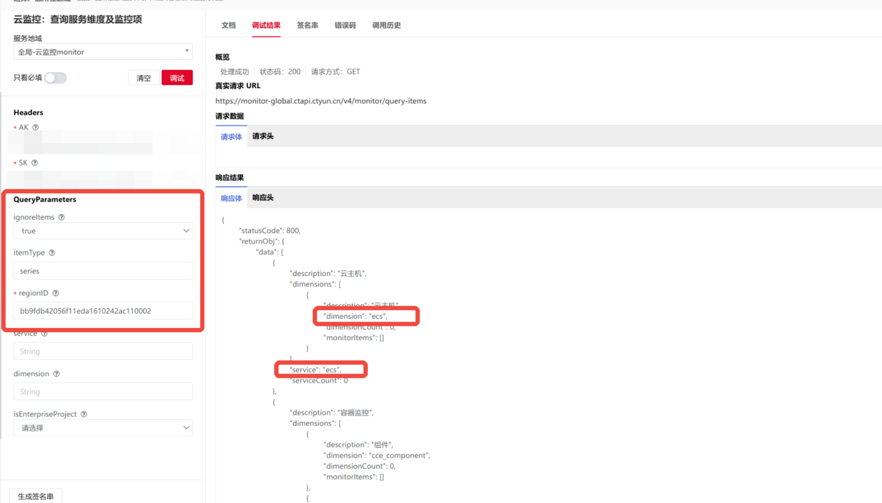 以华东1云主机为例:如下图输入对应的资源池ID,并将ignoreItems选为false,itemType输入series,service、dimension分别取前文获取的对应值,在接口响应中monitorItems为当前资源池支持的所有监控项信息,其中name为指标名,即接口入参中itemNameList中可查询的指标,dimensions为指标的查询标签字段,即接口入参dimensions中name的值,接口dimensions中value的值通常为产品实例的信息(id或名称居多),可通过对应产品的list接口获取得到。