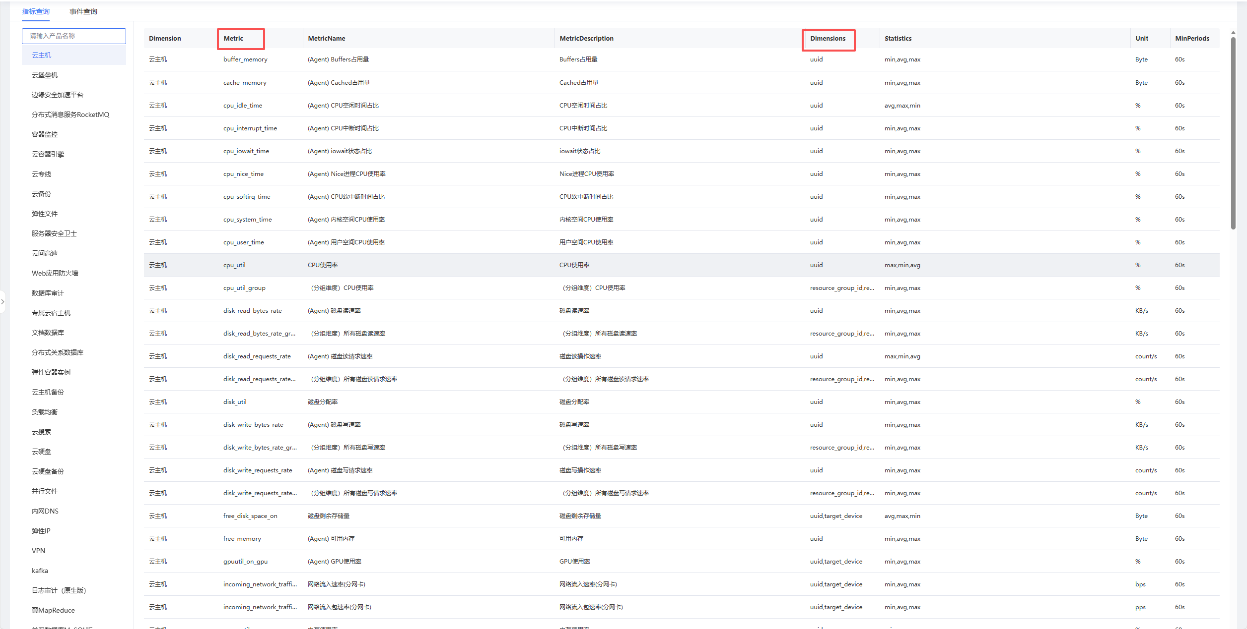 可通过OpenAPI接口:云监控:查询服务维度及监控项获得,接口文档如下: