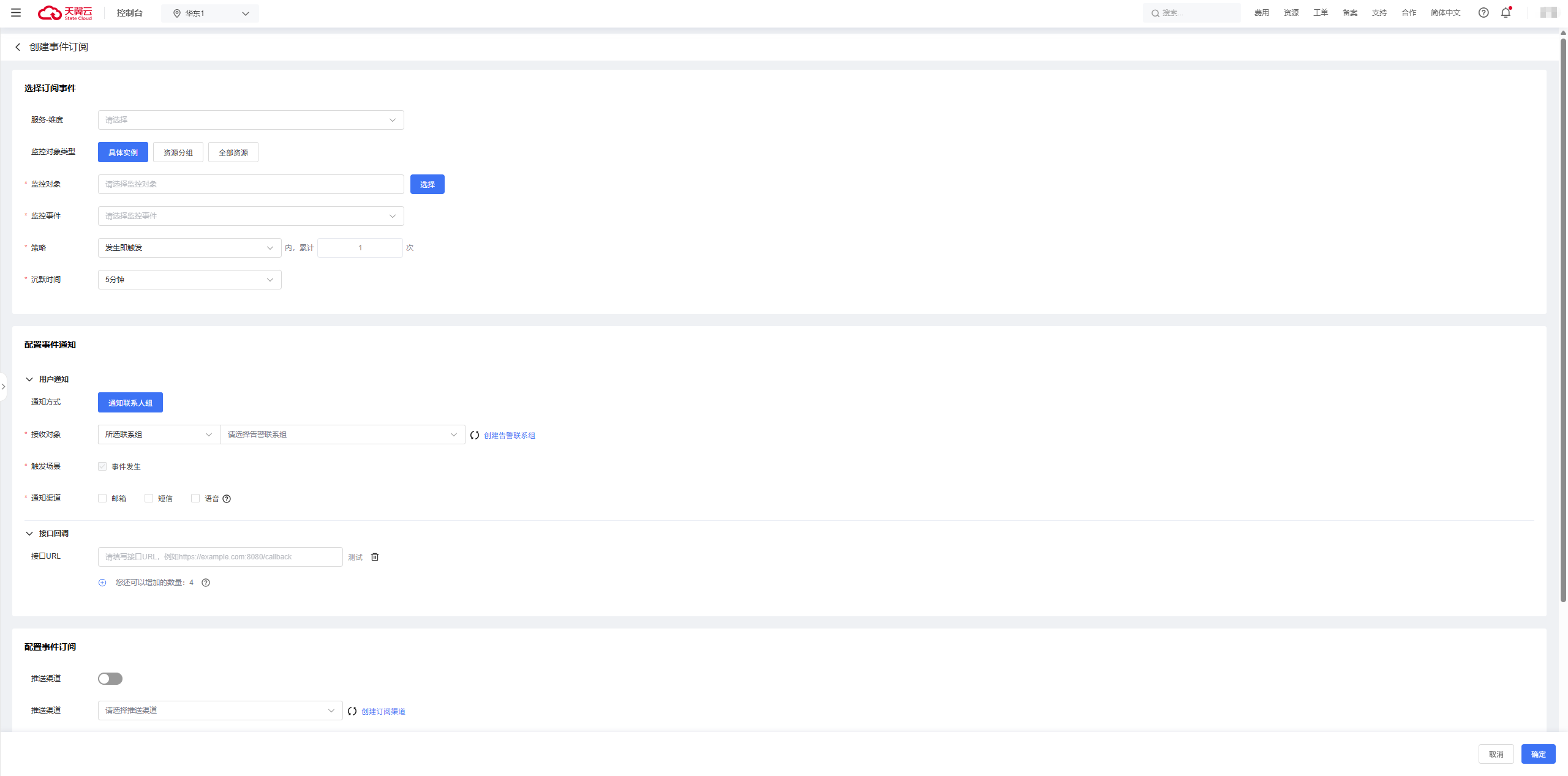 | 配置事件通知 | 推动渠道 | 选择已创建的订阅渠道 | ||