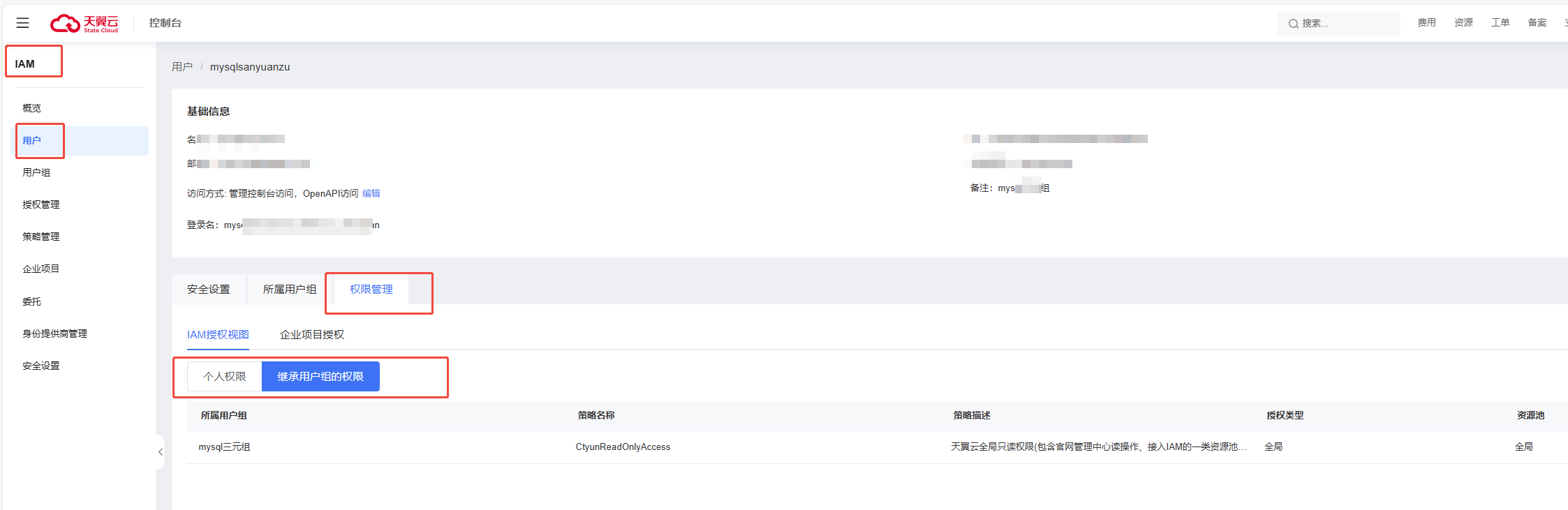如果已经添加了MySQL相关权限,则需要排查是否存在拒绝当前账号所有操作的权限,如:CtyunResourceAdmin ;如有,请选择到这个用户所在的用户组,点击具体用户组右侧的查看按钮,并在权限页面解除CtyunResourceAdmin这个权限。