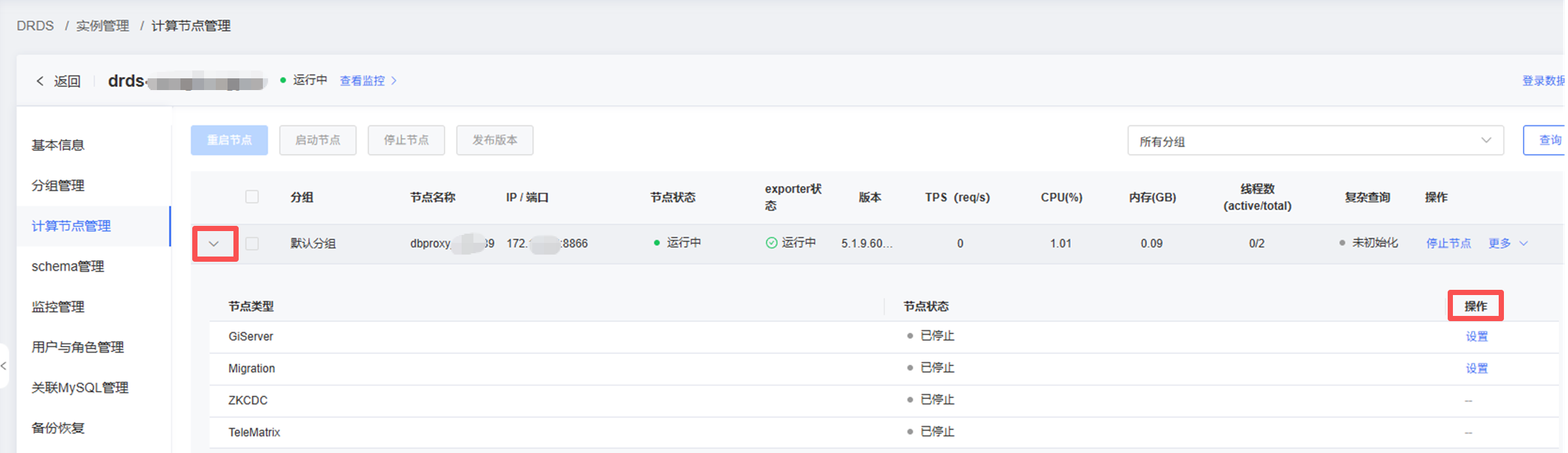 Migration:在节点服务列表中,找到目标服务,单击操作列的设置,进入Schema管理页面,然后在创建分片迁移任务时,选中目标节点即可自动为该节点配置并启动Migration。分片迁移操作,请参见分片迁移。