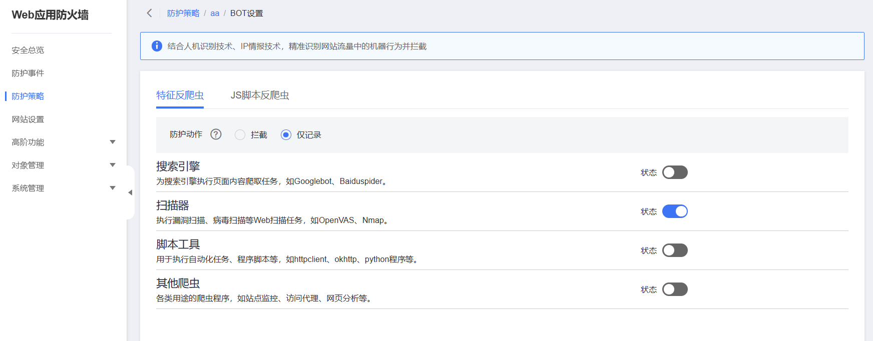 在“特征反爬虫”页签,开启“脚本工具”,“防护动作”设置为“仅记录”(WAF检测为攻击行为后,只记录不阻断)。