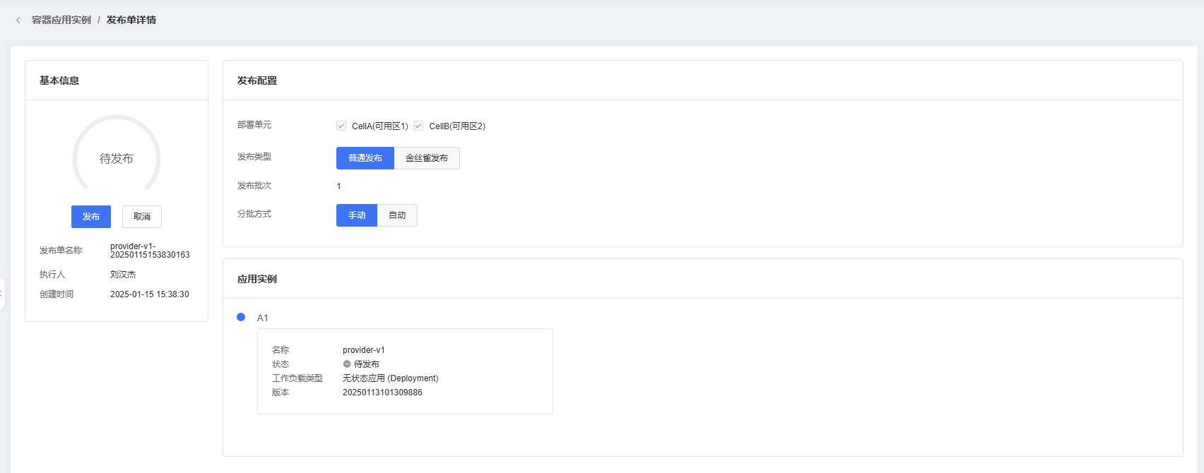 应用实例创建完成后,直接点击查看实例详情按钮,到实例详情页面。点击上方发布应用实例按钮,进入到应用发布界面。点击右下角发布按钮,进入到发布单详情界面。等待发布单完成初始化后再点击发布按钮进行应用发布。应用开始发布后,可点击应用实例发布单,查看应用发布具体信息。