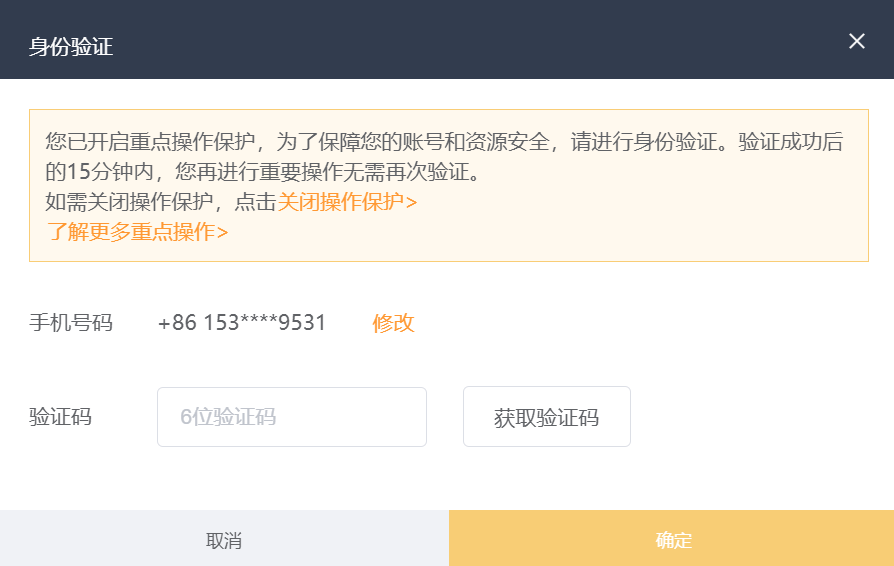 3.点击”确认“按钮后,即可进行重点操作。短信验证功能一旦开启,所有重点操作统一开启,短信验证的有效期为15分钟,15分钟内做其他操作不需要重复验证。