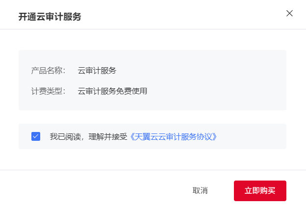 勾选“我已阅读,理解并接受《天翼云云审计服务协议》”,点击“立即购买”,即可完成服务开通。