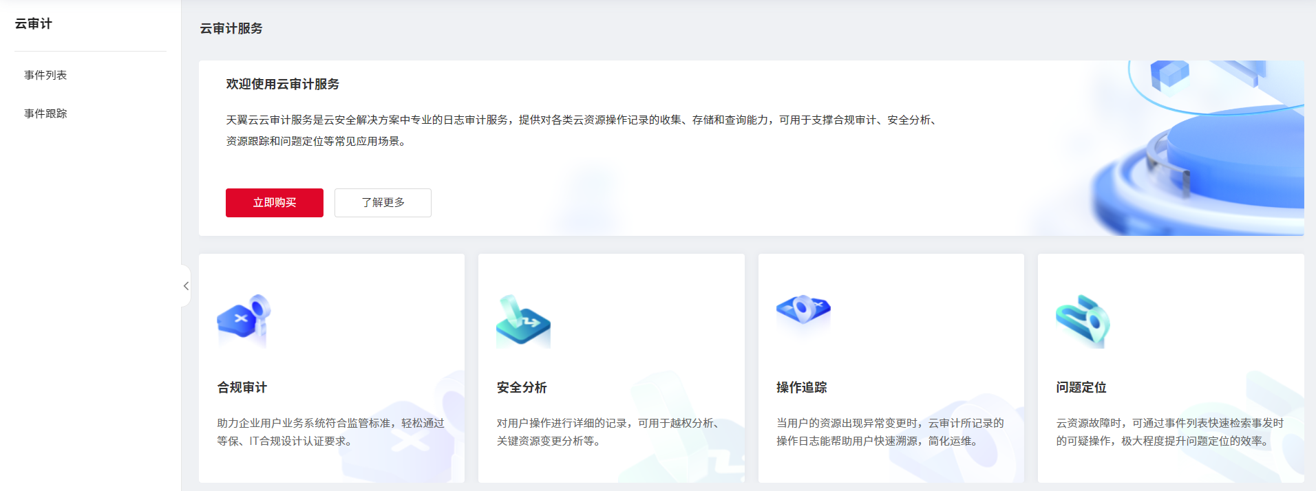 进入云审计控制台,初次使用会显示欢迎使用页面,点击“立即购买”。