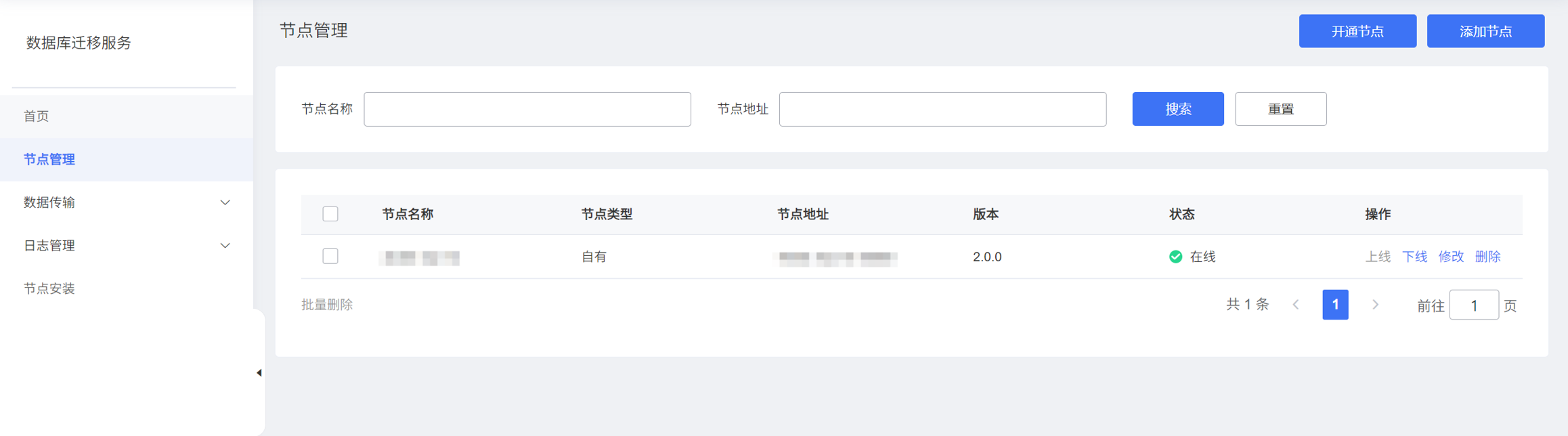 数据库迁移工具提供节点搜索功能,用户可节点名称、节点地址筛选出想要查看或操作的节点。