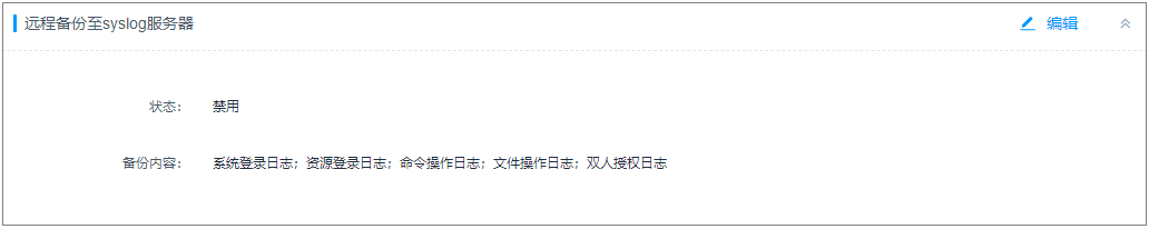 支持备份至Syslog服务器的日志包括系统登录日志、资源登录日志、命令操作日志、文件操作日志、双人授权日志。