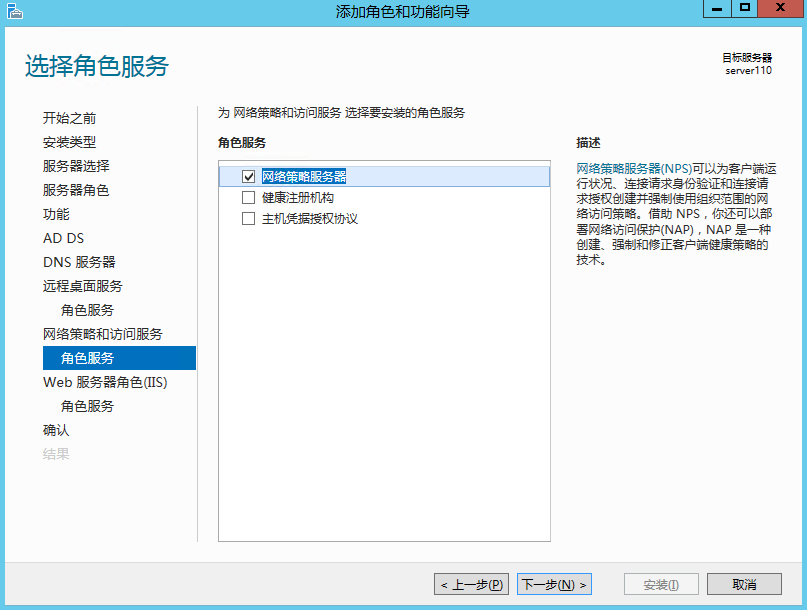 8 (可选)选择“网络策略和访问服务 > 角色服务”,进入选择网络策略和访问角色服务窗口,默认勾选“网络策略服务器”角色选项。