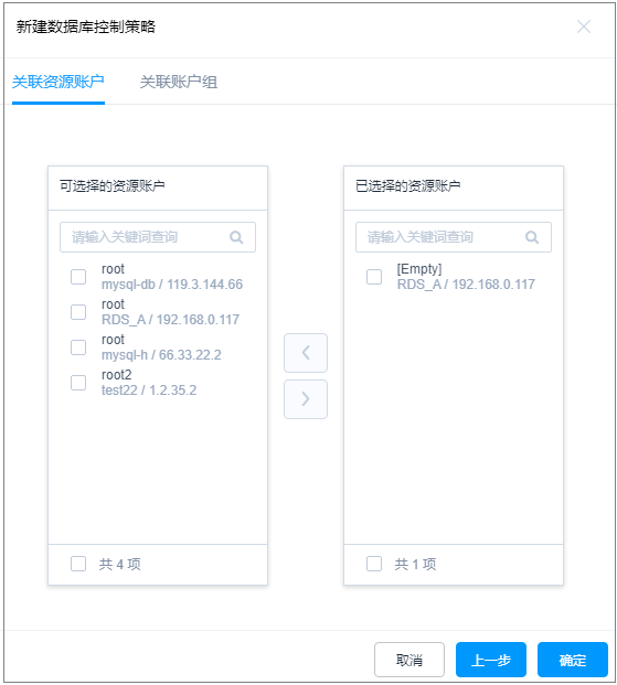 7 单击“下一步”,关联资源账户或帐户组,选择数据库资源账户或帐户组。