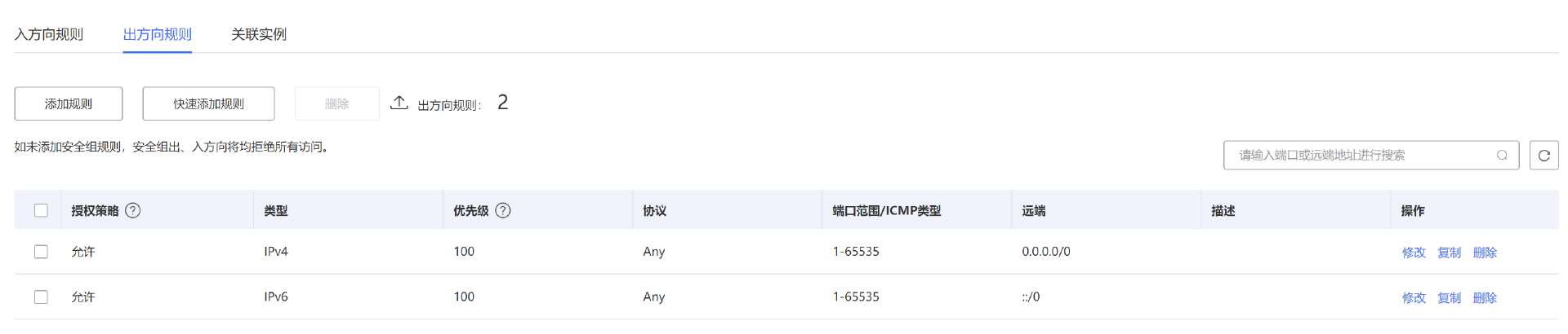 由于云容灾服务需要连通服务端VPC,如果受保护的服务器使用非默认安全组,请确认所使用的安全组配置了出方向规则,示例如下: