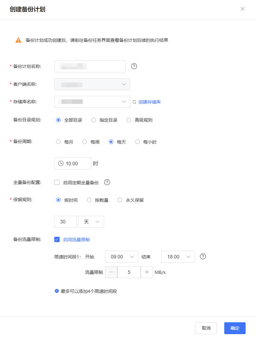 | 备份流量限制 | 配置指定时间段的备份流量速度上限 |