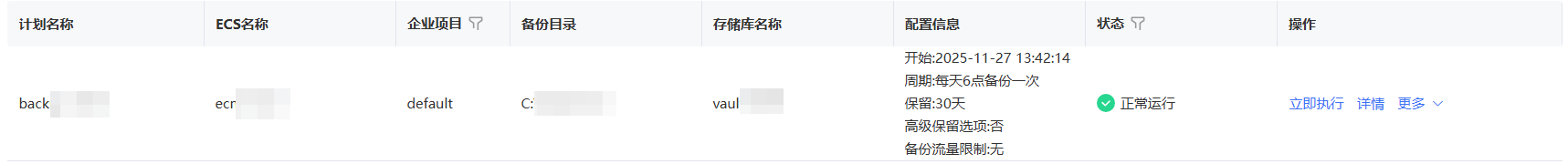 6.单击“确定”,备份计划状态为“创建中”,等待状态变为“正常运行”,即完成备份计划的创建。备份计划创建成功时默认开始执行,在下一个备份节点会自动备份数据,若需立即执行一次备份,请单击“立即执行”。