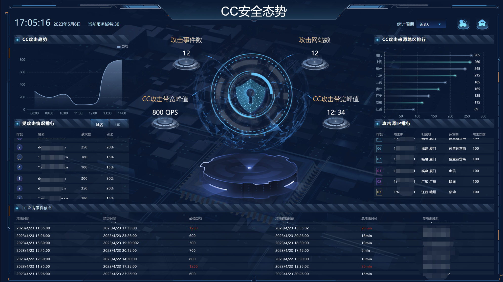 主要包括:CC攻击趋势、攻击来源地区分布、攻击源IP排行、受攻击情况排行、CC攻击事件信息的安全威胁信息等。