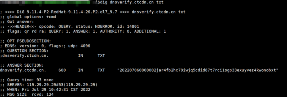 步骤3 如解析出来的txt值和天翼云控制台返回的TXT记录值一致,则表示配置正确。