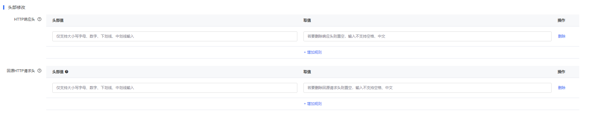 | 取值 | 取值不支持空格及中文文字及字符。 若需要添加/修改对应请求头,请输入取值。 若需要删除对应请求头,取值不填,置为空。 |