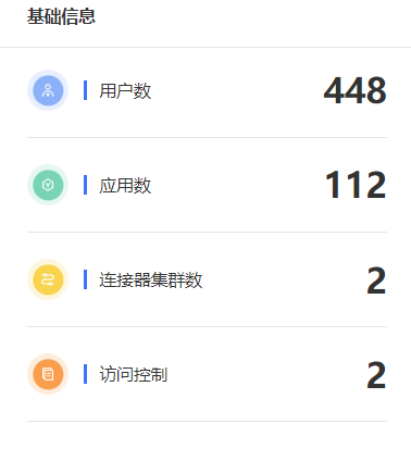 列出企业接入远程零信任办公服务的关键数据情况,您可以点击对应的字段跳转到实际的相关数据页面内容: