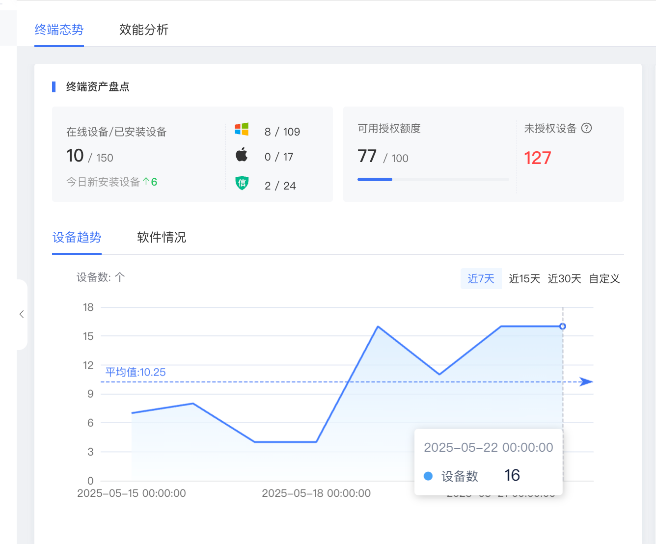 - 设备趋势:展示不同时间段,设备数量变化趋势,支持近 7 天 、 近 15 天 、近 30 天 和 自定义 时间选便于快速查看特定周期内的趋势。