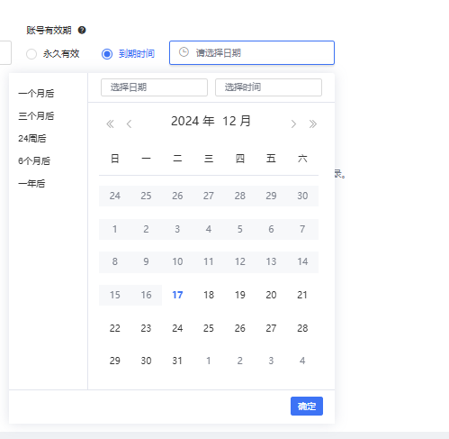 若使用批量导入用户功能,则无此字段,系统会根据密码策略自动生成用户初始密码。 是否审批负责人 非必填,定义其是否为审批负责人,仅定义是审批负责人的人员,才可被其他员工选中为其审批负责人。 审批负责人 非必填,主要用于权限申请环节,若配置需要审批负责人审核,则员工对应的审批负责人将进行审批。 员工属性 非必填,可定义员工属性,如外协、正式,其他。 手机号 非必填,不允许企业内员工手机号重复,手机号用于开启二次认证功能后的短信校验码接收,开启二次认证后未填写手机号的用户,无法接收短信验证码。 邮箱 非必填,填写用户邮箱。 备注 非必填,填写用户备注的一些信息。 账号有效期 非必填,若未选择,则默认是永久有效,可选择账号到期时间,在到期时间之后,该账号将被设置为禁用状态,被禁用的账号在登录后将进行拦截,需重新设置有效期,其账号状态才变成启用。若是被手动禁用的账号,在账号有效期过期后,除重新设置有效期外,还需手动进行账号启用。