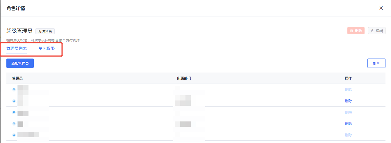 系统角色:为系统预设,无需自行创建,也不可删除/编辑,可直接添加管理员。零信任服务的系统管理员角色内置了四种:
