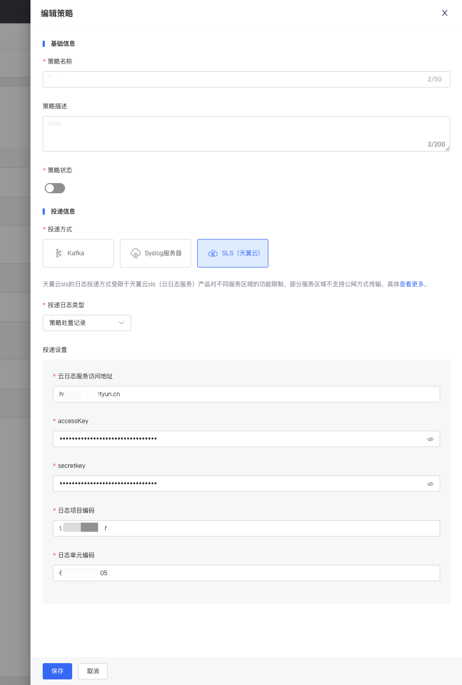 | 投递设置 | 设置投递方式的详细配置,具体参数如下: 1、Kafka:需设置Kafka服务器地址、Topic(Kafka事件流主体)、认证方式(可选:无、SASL/PLAIN),若选择认证方式,则需提供用户名、密码。 2、Syslog服务器:需设置Syslog服务器地址,投递协议可选:TCP、UDP。 3、SLS(天翼云):需设置云日志服务访问地址、accessKey、secretkey、日志项目编码、日志单元编码。 说明 天翼云sls的日志投递方式受限于天翼云sls(云日志服务)产品对不同服务区域的功能限制,部分服务区域不支持公网方式传输,具体查看更多。 |