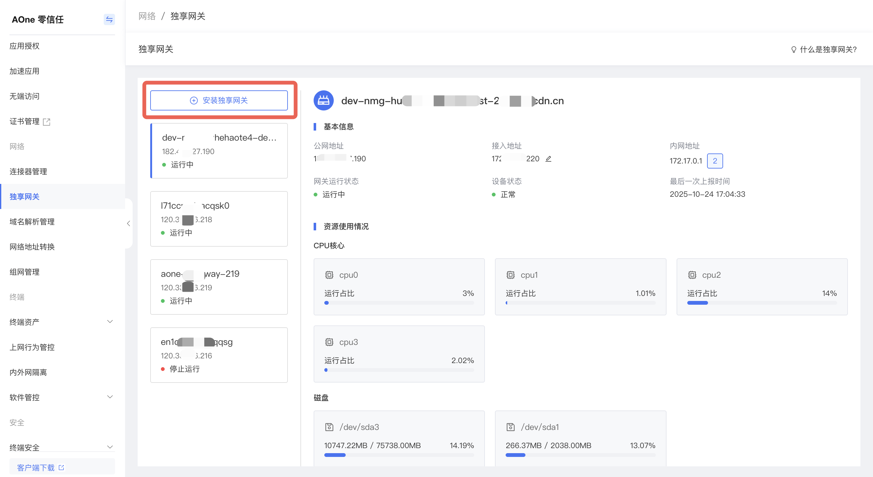 请登录边缘安全加速服务平台控制台,选择AOne零信任服务工作台,进入工作台,网络-》独享网关菜单,点击新增独享网关,复制安装命令,进行一键部署安装。