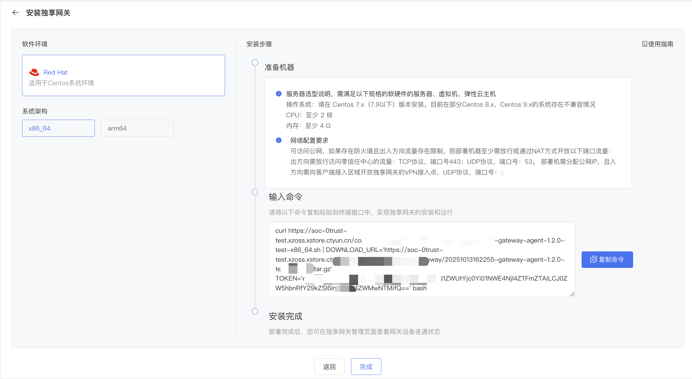 独享网关安装后,将在机器上部署Docker组件,独享网关实际运行在容器环境中,若客户的操作系统为其他类型操作系统(指基于linux内核的其他操作系统),可在实际安装时,根据CPU架构选择不同的安装命令进行尝试安装。独享网关不适配WIndows类型操作系统。