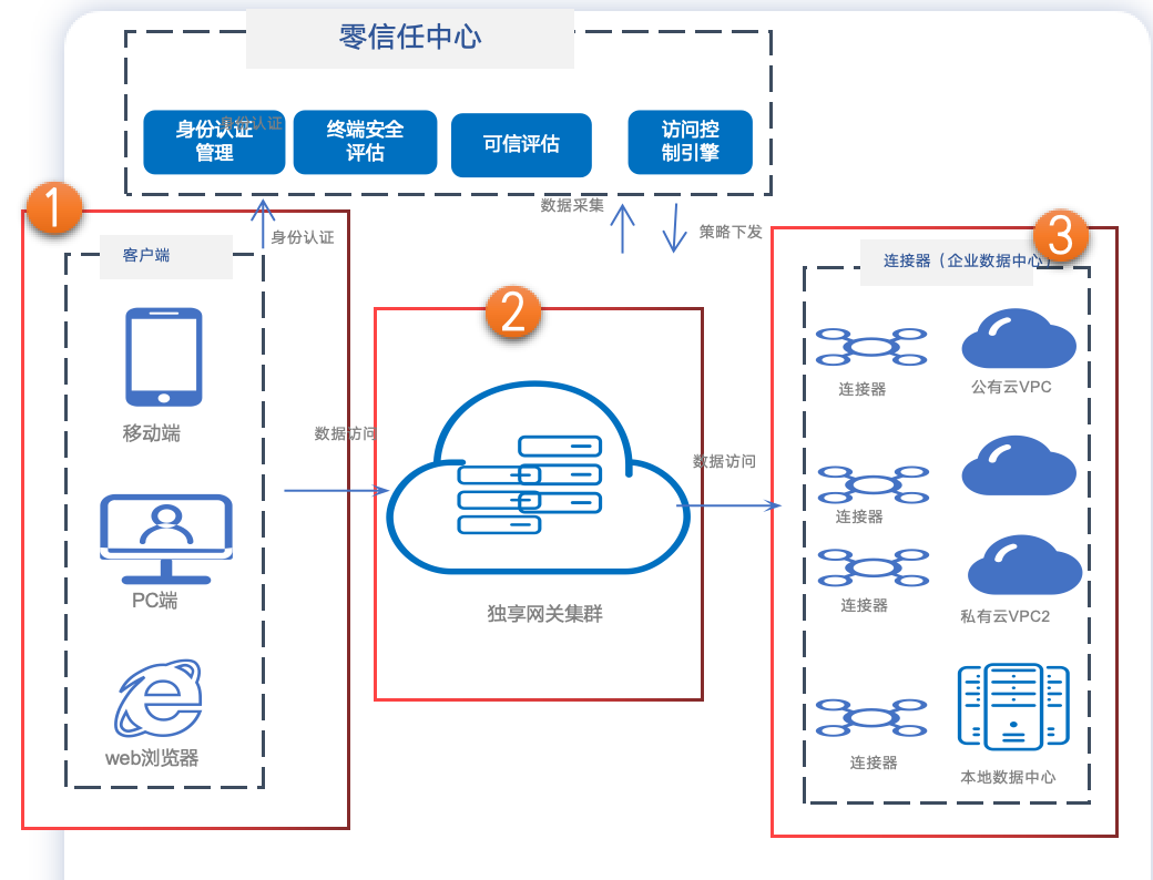 混合部署模式下,零信任中心saas化提供,零信任安全网关独立部署在客户机器,支持网关集群化部署,实现高可用以及稳定性提升。 连接器(可选):若企业只有一个数据中心,则无需部署连接器,部署连接器能支持跨数据中心统一接入。