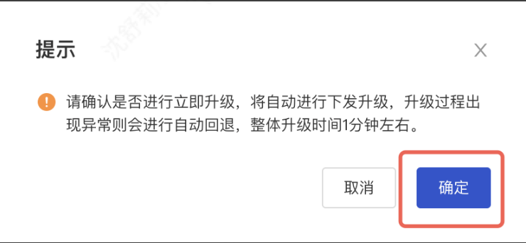 3、弹窗点击确定,等待自动升级完成即可,升级过程中约 1 分钟左右。如果多次点击立即升级后,发现均无法升级成功,可以通过客服工单联系我们寻求技术支持。