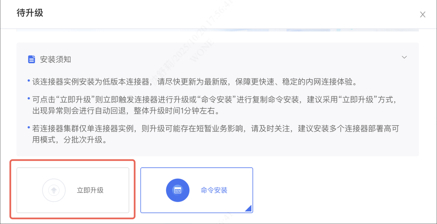 登录控制台,进入 “连接器管理” 模块;找到标记 “待升级” 的 1.21 及以前版本连接器实例,点击橙色按钮;跟随页面指引完成操作,全程无需停机(可参考如下升级步骤指南)。若升级失败,系统将自动回滚至前一可用版本,不影响业务正常运行;若遇到多次升级失败的情况,可通过提交工单获取技术支持。