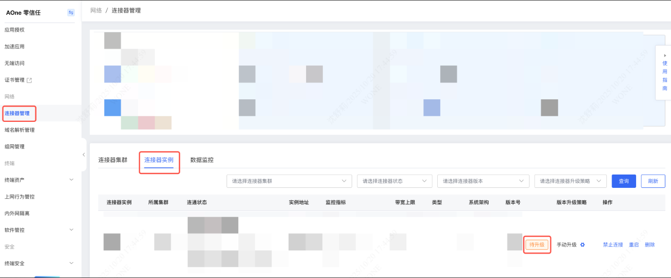 1、登录AOne 零信任控制台,找到连接器管理,点击进入后找到对应的连接器实例,需要升级的连接器实例在版本号一栏有橙色的“待升级”按钮,点击待升级按钮。