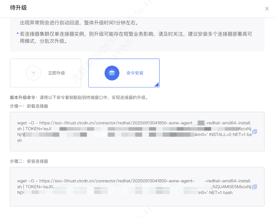 该方式需要登录连接器所在进行进行命令升级,操作较麻烦但整体稳定性更高,因为此次命令安装方式是通过卸载旧版本,升级新版本进行安装,组件更纯粹,有条件登录机器的客户,更推荐使用该方式进行升级。