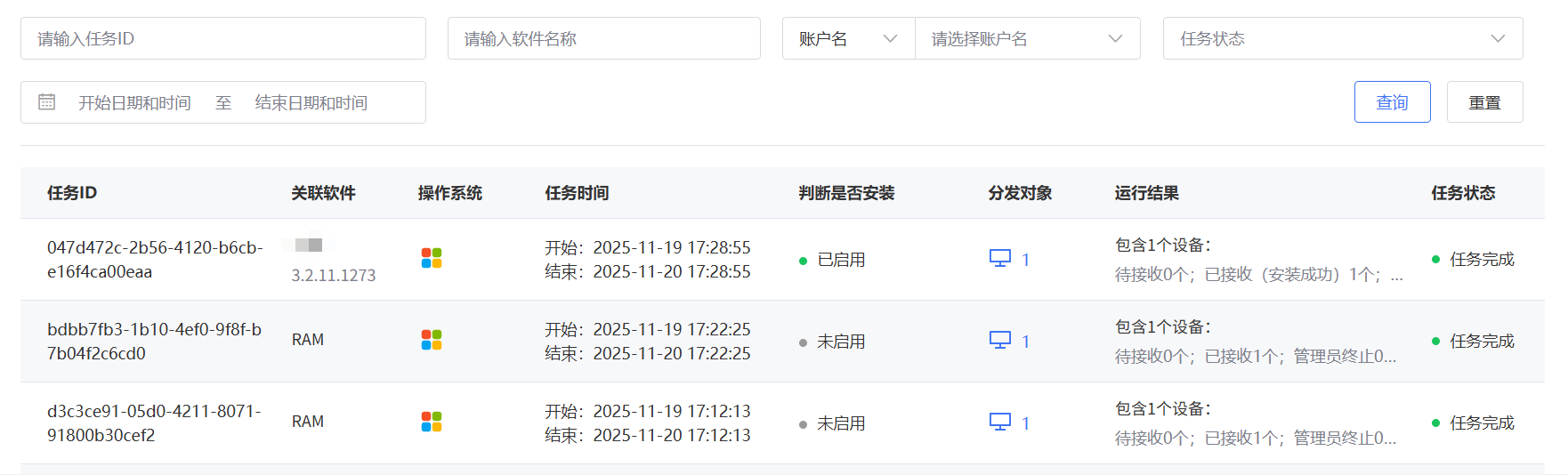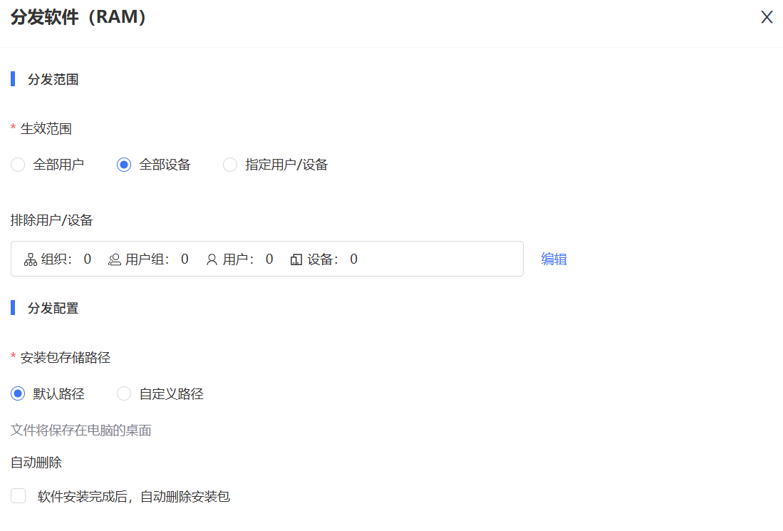 点击操作栏的“分发”,即可将安装包分发至所选终端,主要字段说明如下。