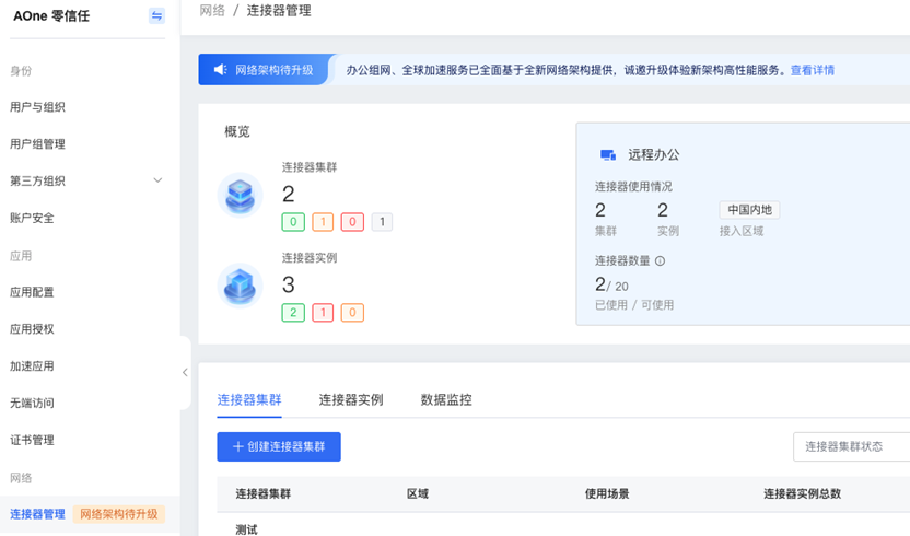 1、本次架构升级依赖连接器版本升级为1.31.0及以上,建议采用最新版本的连接器,低版本连接器可根据【公告】关于 AOne 零信任连接器 1.21 及以前版本升级的重要公告进行相关操作升级。