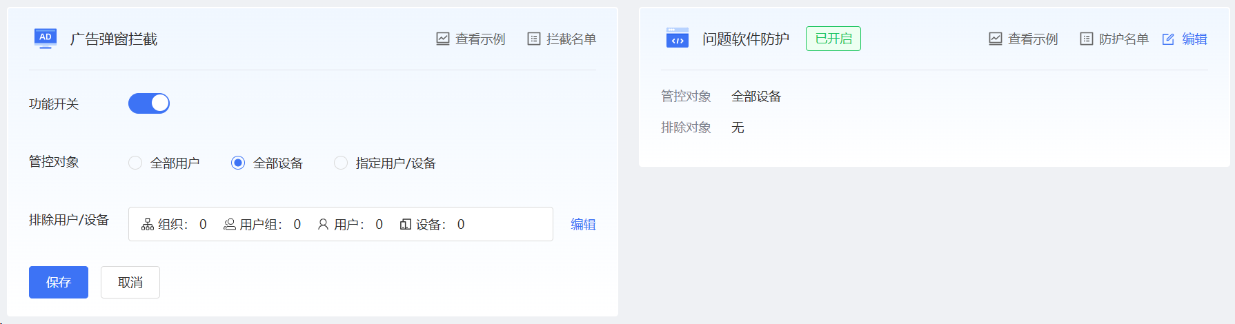 点击卡片中的【编辑】按钮,即可配置当前功能(广告弹窗拦截、问题软件防护)。