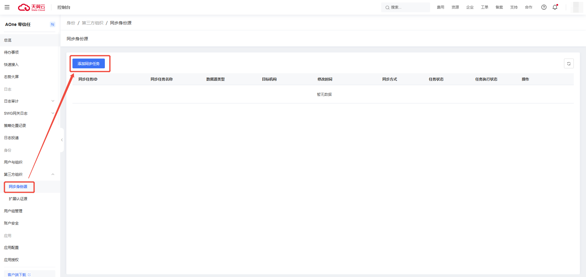 在左侧导航栏身份-第三方组织,选择同步身份源菜单