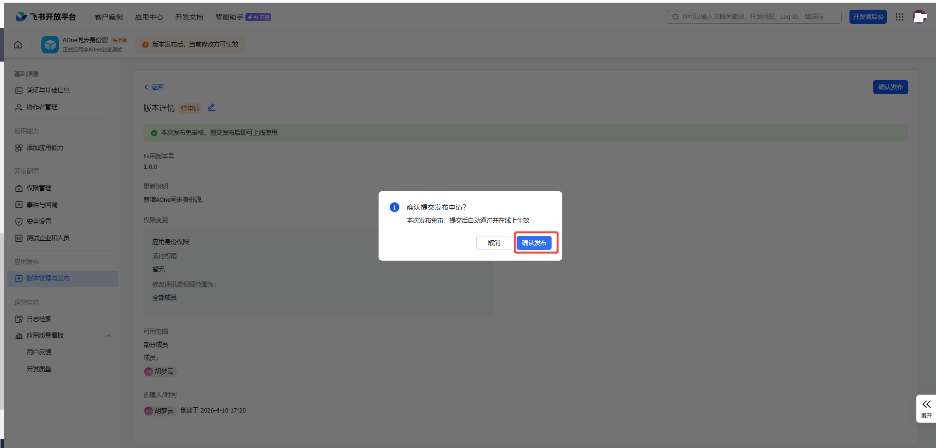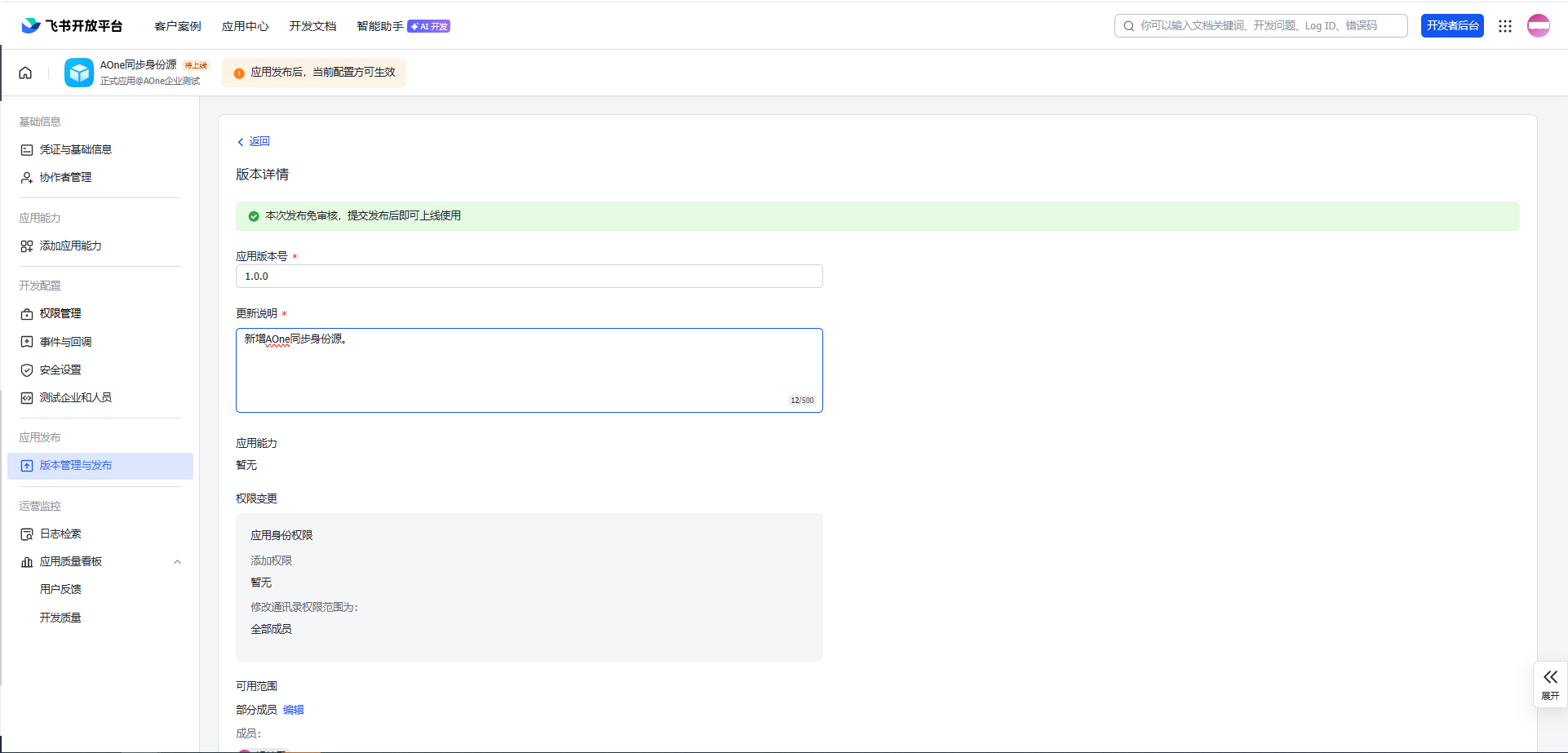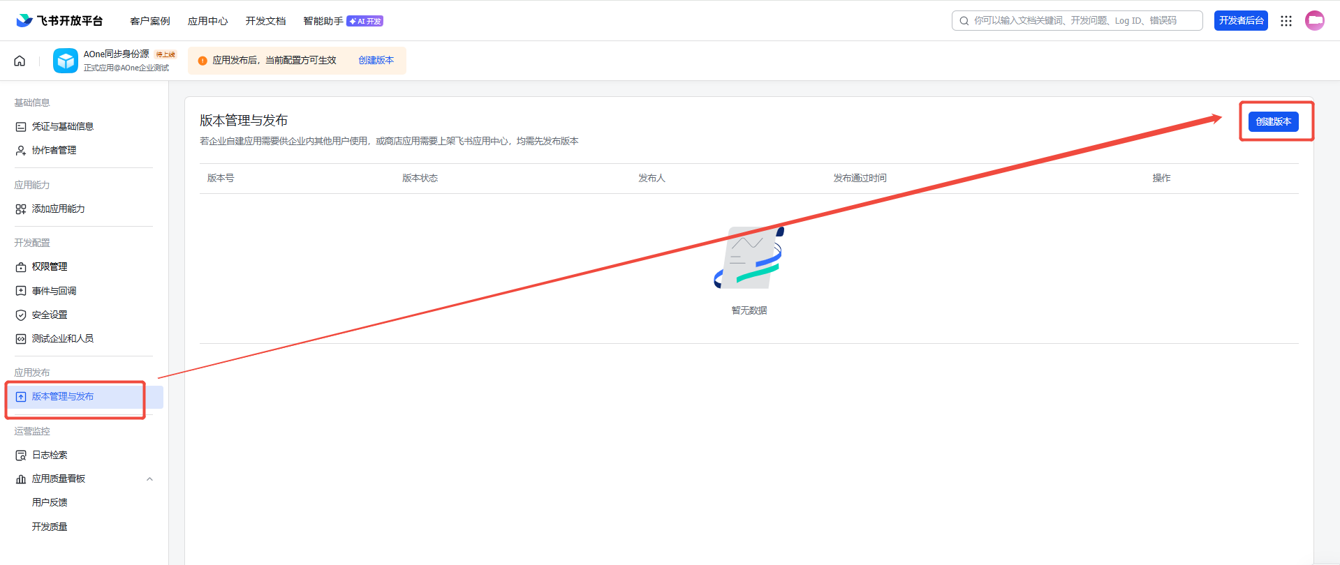 继续在该应用中配置,点击应用发布-版本管理与发布菜单,点击创建版本,保存审批完成后即可。说明:不一定需要审批流程,看企业飞书中的配置。