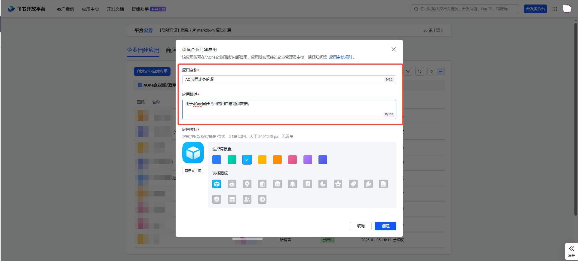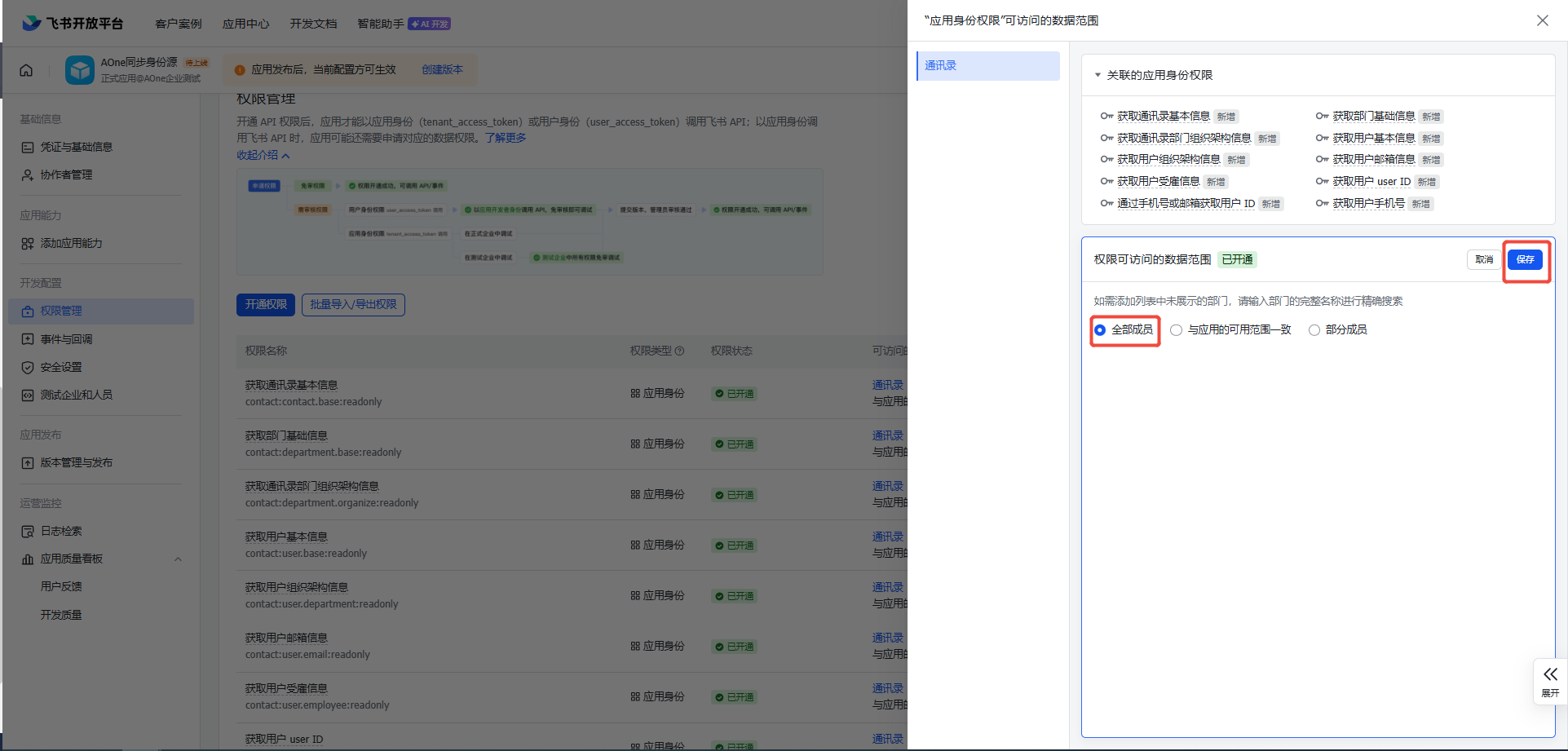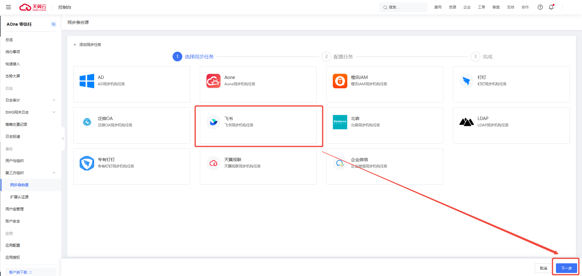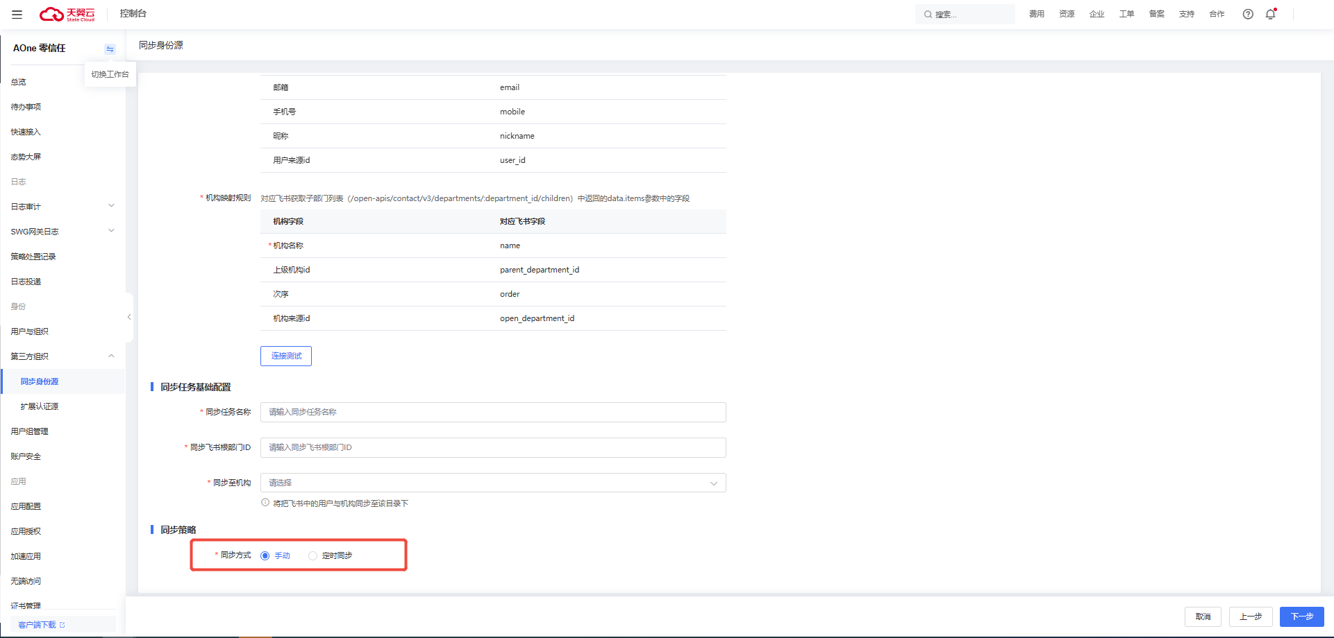 | 3 | 同步至机构 | 所有在飞书中获取的成员和部门信息同步至AOne平台该机构下,若无法选中,请先到 【身份】-【用户与组织】菜单下新建一个组织 |