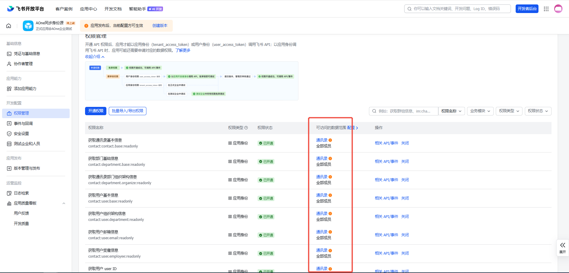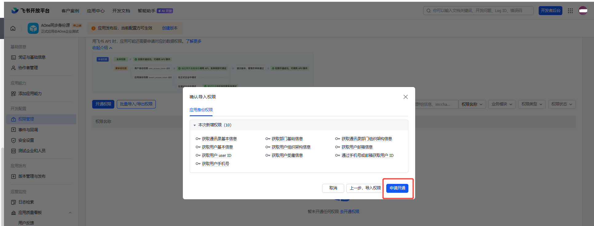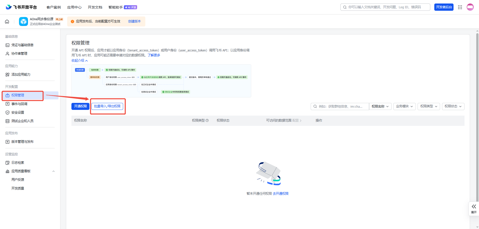 进入步骤1创建的应用,点击开发配置-权限管理菜单,点击批量导入/导出权限按钮
