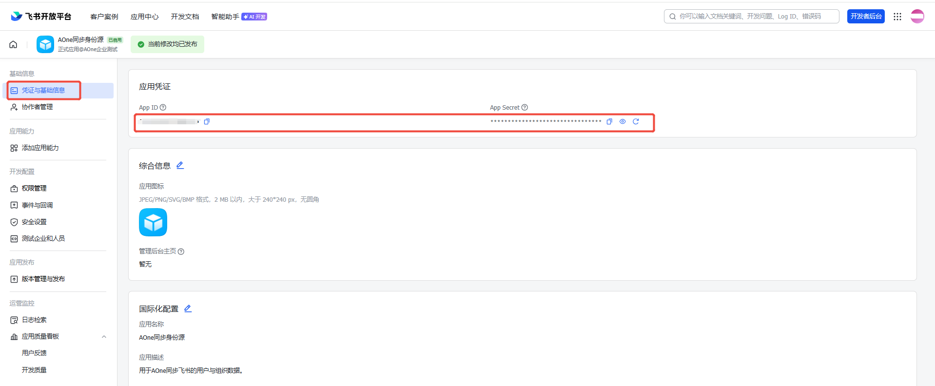 | 1 | AppID和AppSecret | 进入上面创建的应用,点击凭证与基础信息菜单,获取AppID和AppSecret参数 |